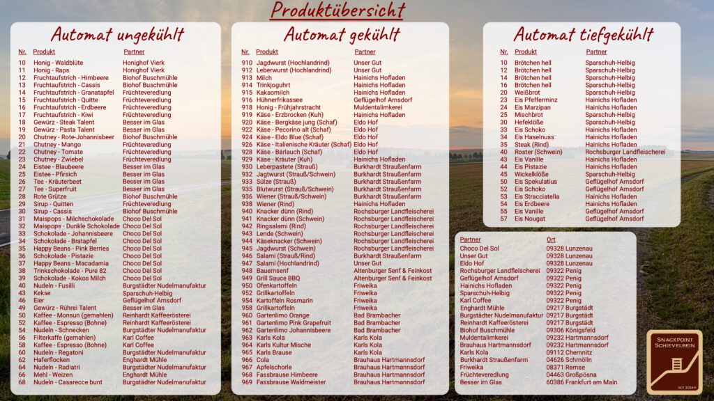 Herzlich Willkommen Unser Snackpoint Schievelbein wurde 2024 gegründet. Homepage wird aktuell überarbeitet ! Jetzt mit aktueller Produktübersicht !!! Adresse Mandy und Ronny SchievelbeinKellerberg 809328 Lunzenau OT Rochsburg Kontakt Telefon: 017682226834E-Mail: info@snackpoint-schievelbein.de Website: www.snackpoint-schievelbein.de Impressum Datenschutzerklärung © Snackpoint Schievelbein 2025